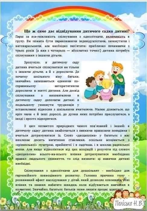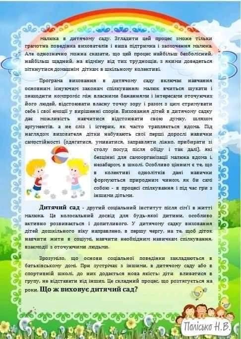 КОНСУЛЬТАЦІЯ ДЛЯ БАТЬКІВ22.01.2024 Для батьків Консультація для батьків – “Що виховує дитячий садок?” Поширити: