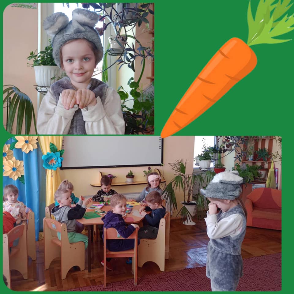 Сьогодні діти середнього віку “Світлячок” допомогли маленькому Зайченятку визначитися, яка їжа є корисною і зробили для нього та його родини багато морквинок